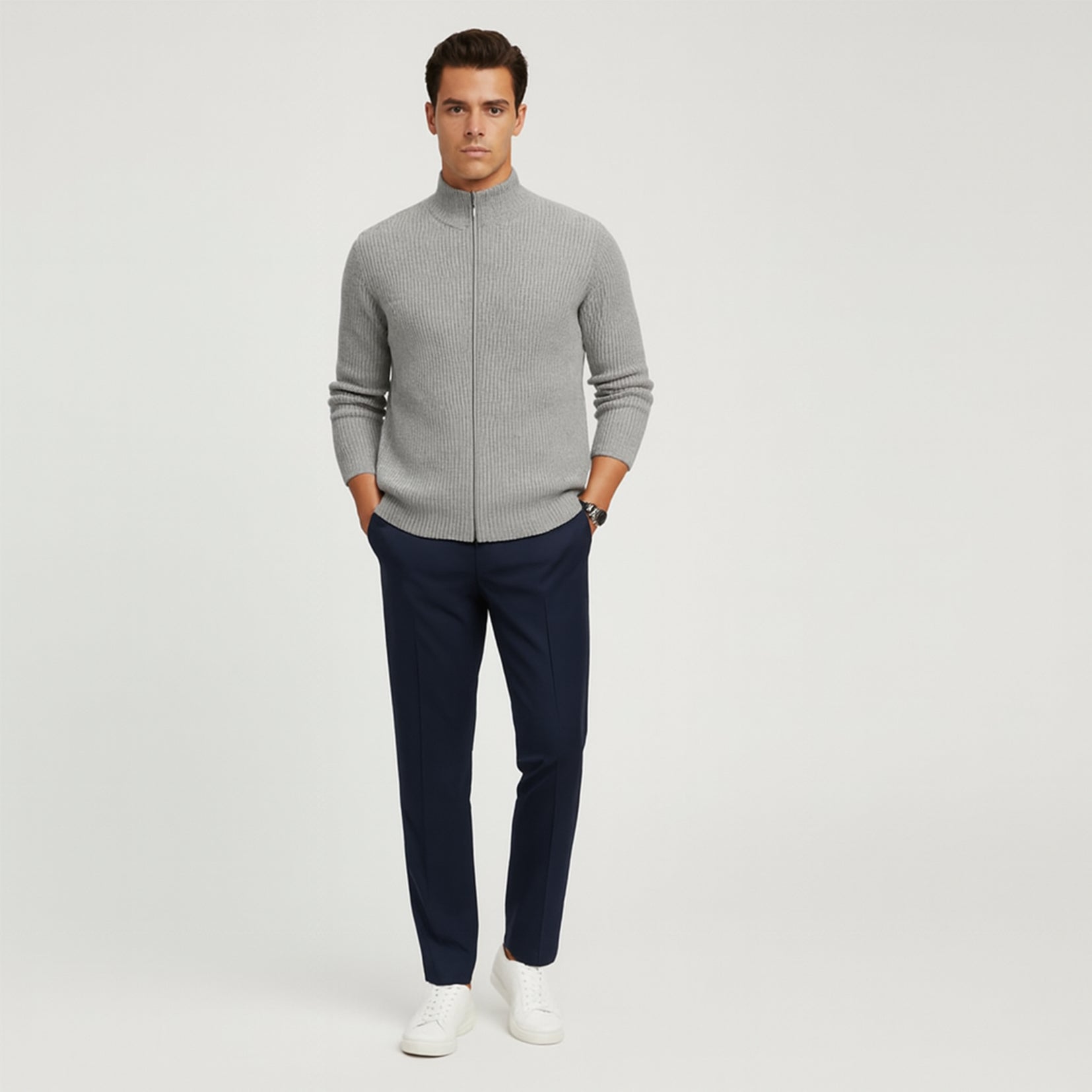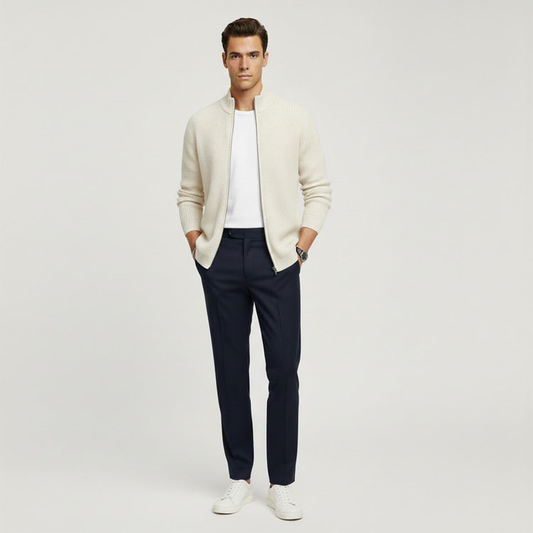 Una elegante chaqueta de punto acanalado con cremallera frontal completa y cuello alto para un look moderno y minimalista. Confeccionada en tejido suave y estructurado, ofrece calidez y versatilidad, ideal para combinar con otras prendas en las estaciones más frías.
