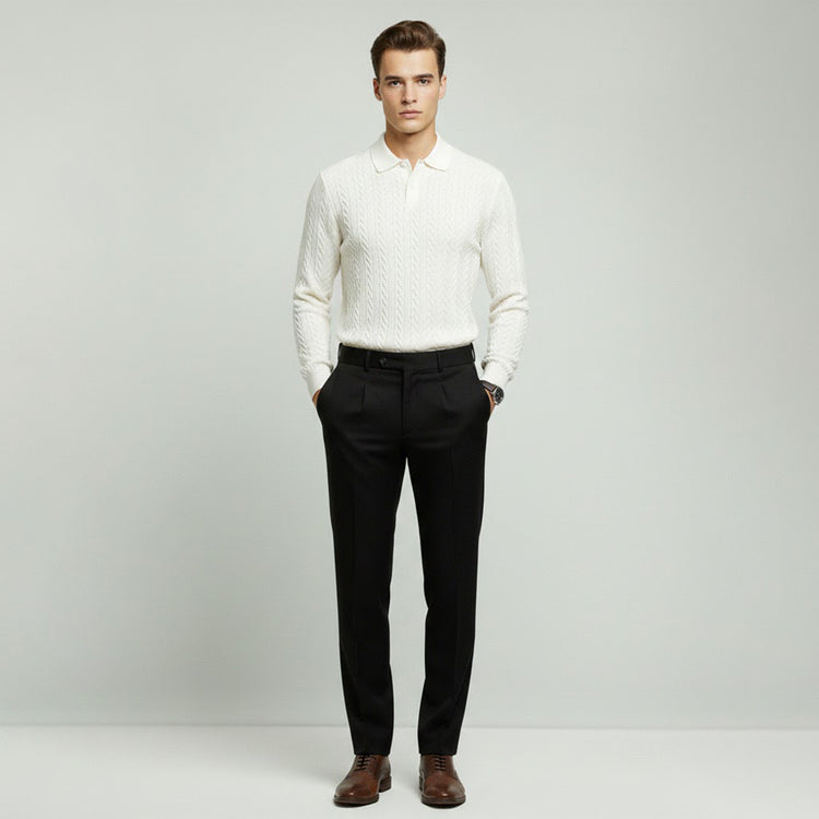 A knitted polo designed for understated sophistication. The vertical ribbing adds depth, while the relaxed fit ensures all-day ease. Perfect for layering or wearing solo, this versatile staple balances comfort with timeless appeal.